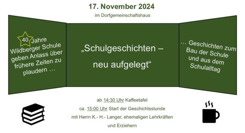 Über 40 Jahre Wildberger Schule geben Anlass, über frühere Zeiten zu plaudern. Am 17. November 2024 im Dorfgemeinschaftshaus Wildberg. Ab 14:30 Uhr Kaffeetafel. Gerne könnt […]
