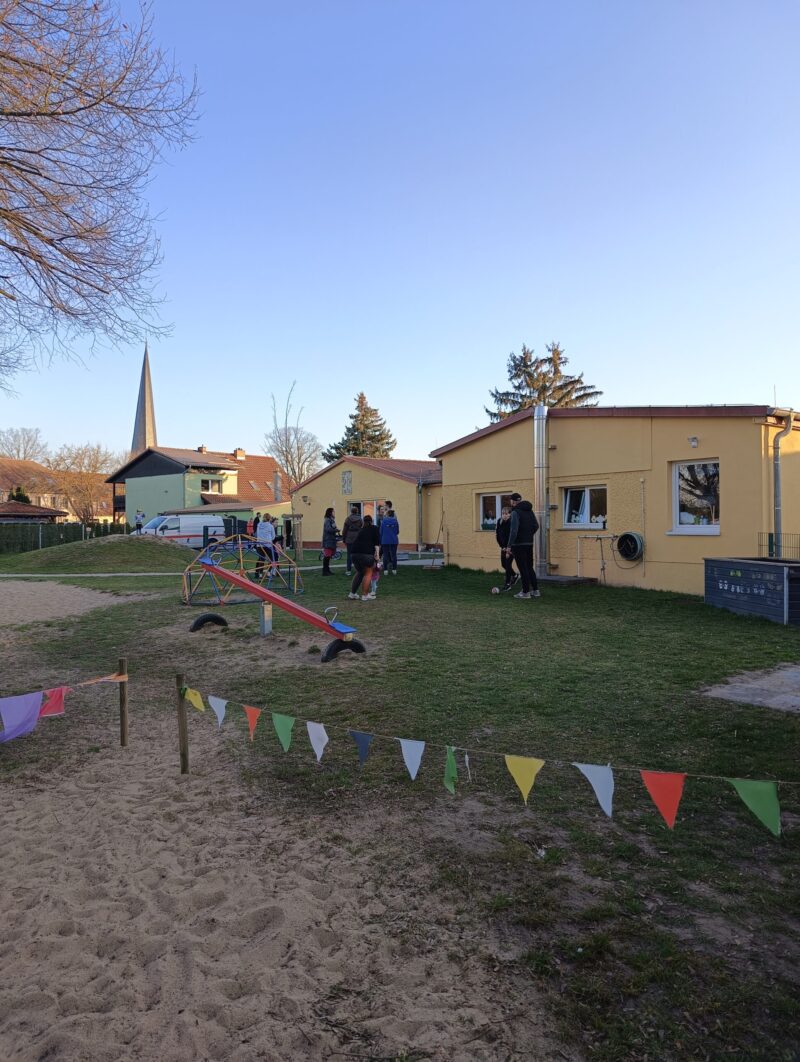 Die Blumenbeete entlang des Zauns wurden neu gestaltet, zahlreiche bepflanzte Gummistiefel – unter anderem mit Petersilie und Minze – wurden dekorativ an den Zäunen angebracht, sodass die Kinder später selbst ernten und probieren können. Auch die Hochbeete wurden vorbereitet, damit dort bald eigenes Obst oder Gemüse angepflanzt werden kann. Der Komposter wurde versetzt, um Platz für einen neuen Zaun zum angrenzenden Dorfgemeinschaftshaus zu schaffen. Dieser soll das Außengelände für die 60 Kinder erweitern.